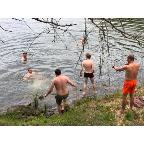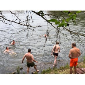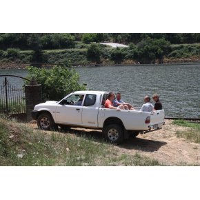 Vi mødtes alle hos Bulas nær Gouvinhas til middagstid og blev monteret på ladet af et par firehjulstrækkere. Turen gik ned til floden (her løber Rio Ceira ud i Douro) og der var fællesbadning i det dejlige vand. Halvdelen af selskabet greb chancen for en dukkert sammen med Mr. Bulas (Himself), der havde gjort os muntert selskab. Lidt snacks, håndplukkede morbær og appelsiner blev det til, inden ture til Quinta’en med et smut forbi en af de gamle vandhuler. De blev før i tiden benyttet til vandforsyning i markerne, men ligger nu mere eller mindre ubenyttet hen. Man kan kigge dybt ind i bjerget og der blev faktisk pumpet vand derfra, mens vi var der.