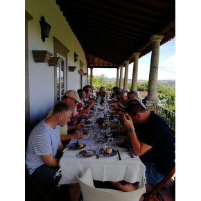 Hele gruppen mødtes om eftermiddagen på Miradouro São Leonardo de Galafura i det centrale Douro. Et spektakulært udsigtspunkt, hvor flere berømte Quinta’er kan anes og ikke mindst Douros storhed nydes. Det blev selvfølgelig akkompagneret af to glas portvin (der blev altid medbragt glas og smagsprøver i bilen): 10 års Fonseca og Cruz LBV 2001.