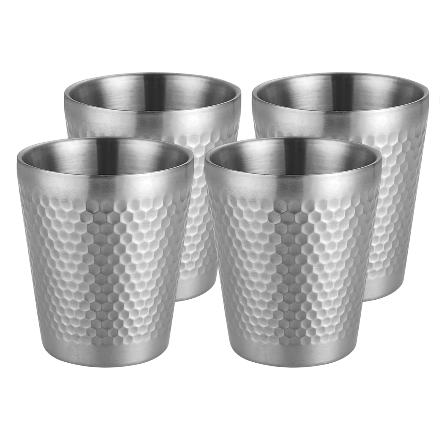 Den hamrede overflade giver et godt greb, og den dobbeltvæggede konstruktion hjælper med at holde temperaturen, uanset om koppen bruges udendørs, på jagt, på golfbanen eller andre steder, hvor glas ikke er det oplagte valg.
