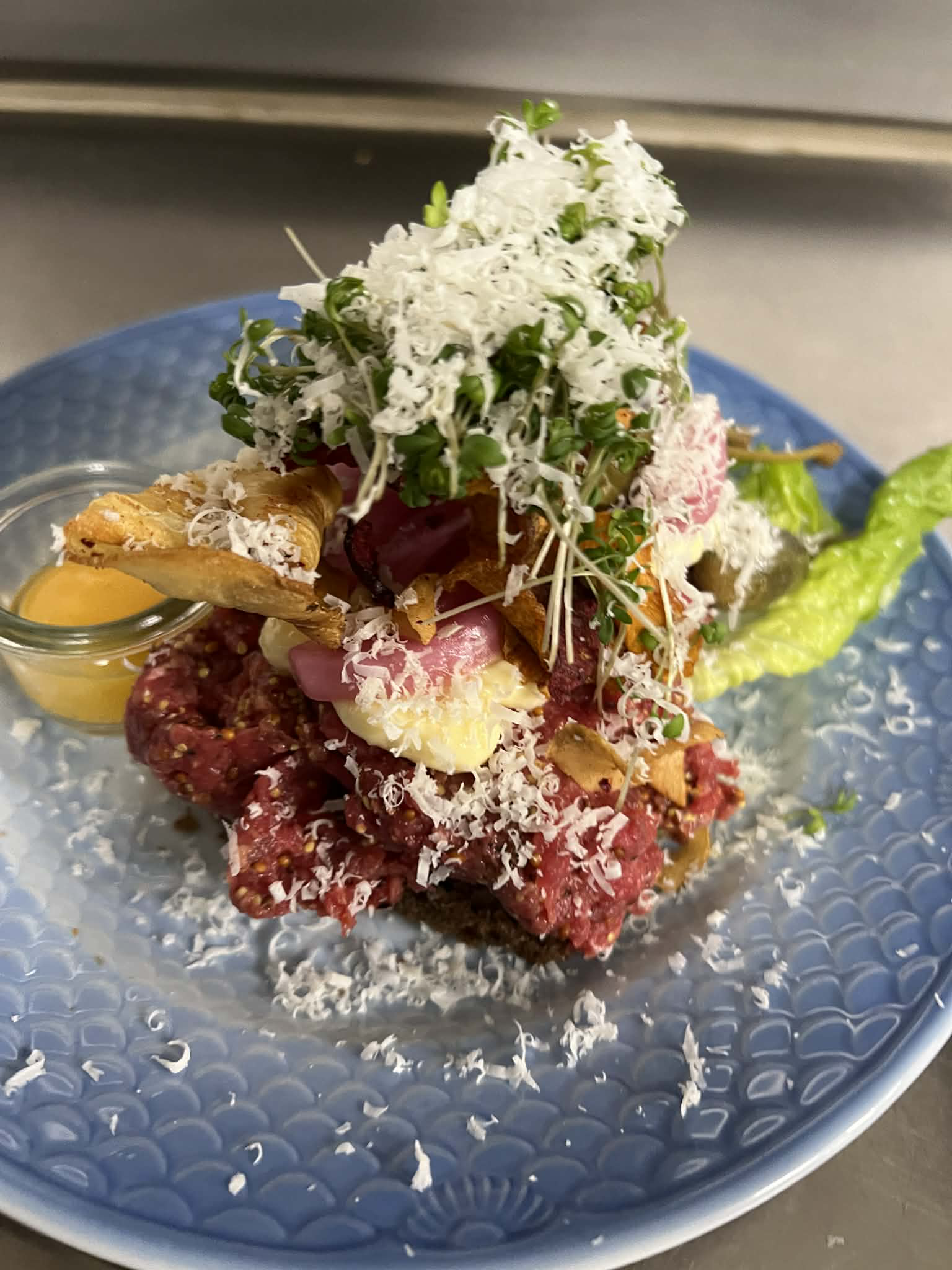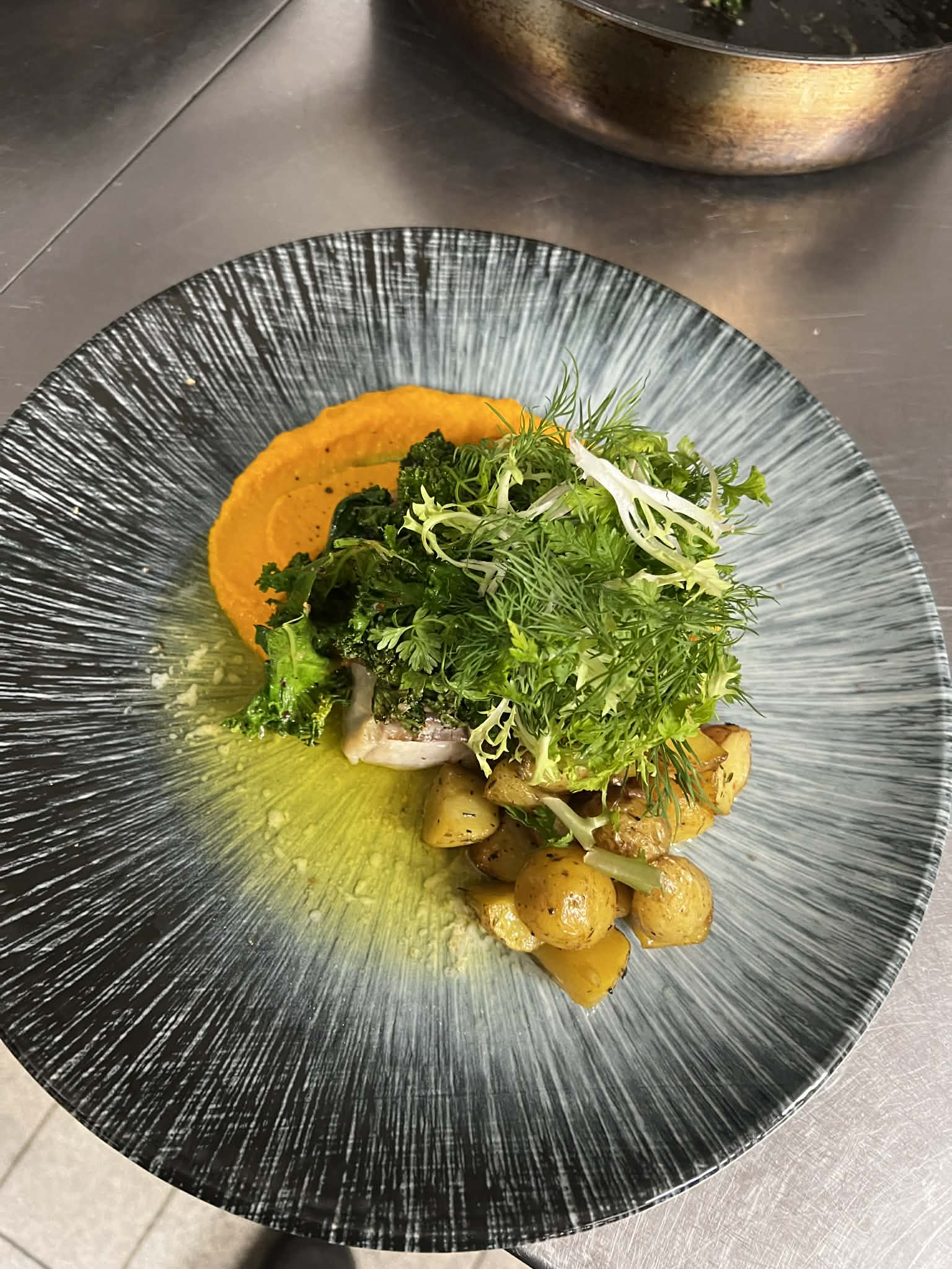 - Farseret vagtel med Karl Johan-svampe og rørhatte med Sauce au Porto, kartoffelpuré, smør pocherede porre med friteret kapers.